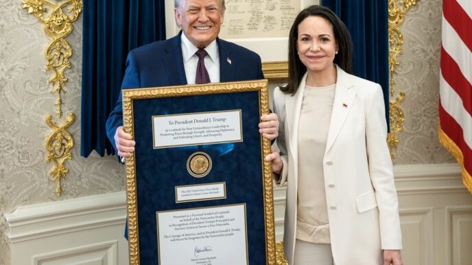 Aktualno Politika Zanimivosti Trump simbolično prejel Nobelovo nagrado za mir od venezuelske političarke 16 januarja, 2026